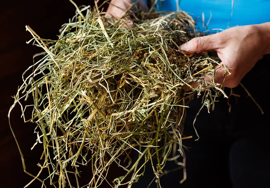 "Hay with the highest digestive energy will be green, have a fine, thin stem, and be soft and flexible. It may smell a little like green tea. Pick the hay up in your hands and rub it: it should feel a little bit gritty." Hay with the lowest digestible energy is "dry and looks like straw. It might feel prickly and smell a little moldy."