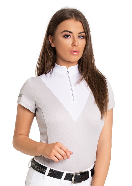 This stunning competition shirt from Aztec Diamond’s latest collection features a diagonal design on both the back and the front creating a sophisticated look. The shirt has detailing on both sleeves and a chic black rubber logo badge added to the back. The high neck zip opening on the front makes this shirt perfect for competition or training as you can wear the collar up or folded down like a polo.