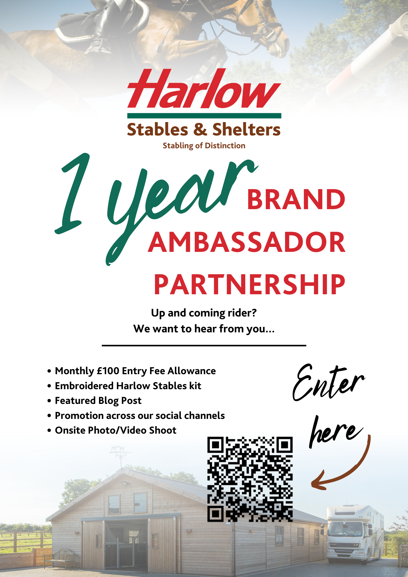 We’ll help you with £100 p/mth entry fees payment, featured blog post, embroidered Harlow Stables & Shelters kit for you and your horse PLUS our media team will pay you a visit for an on-site content shoot with Q&A sessions.
