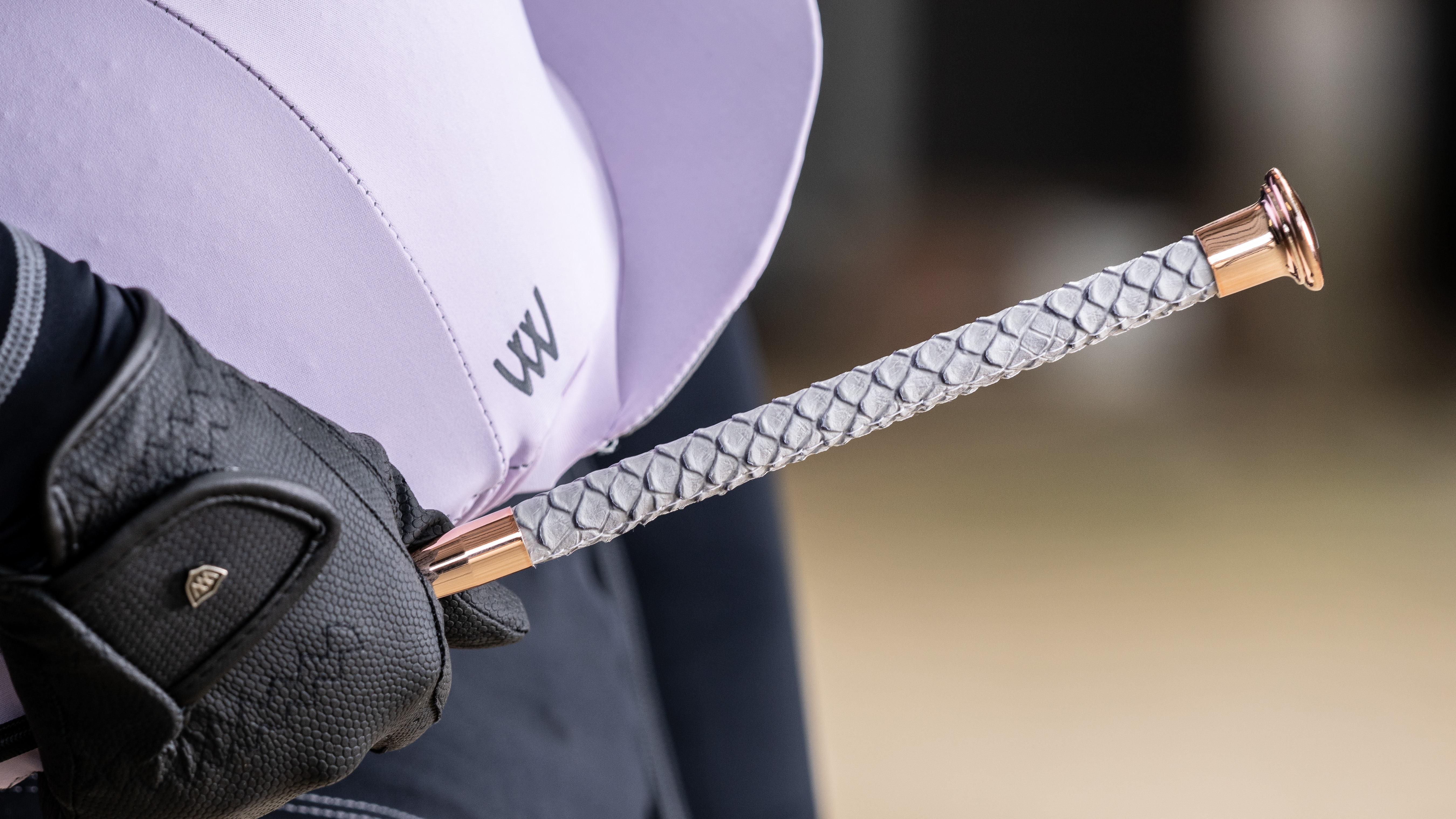 Featuring a flexible Fibreglass Shaft, for perfect balance, an elegant slim grip, and a branded end cap. Riders will love this stunningly elegant whip, arriving just in time to dazzle the judges this summer.