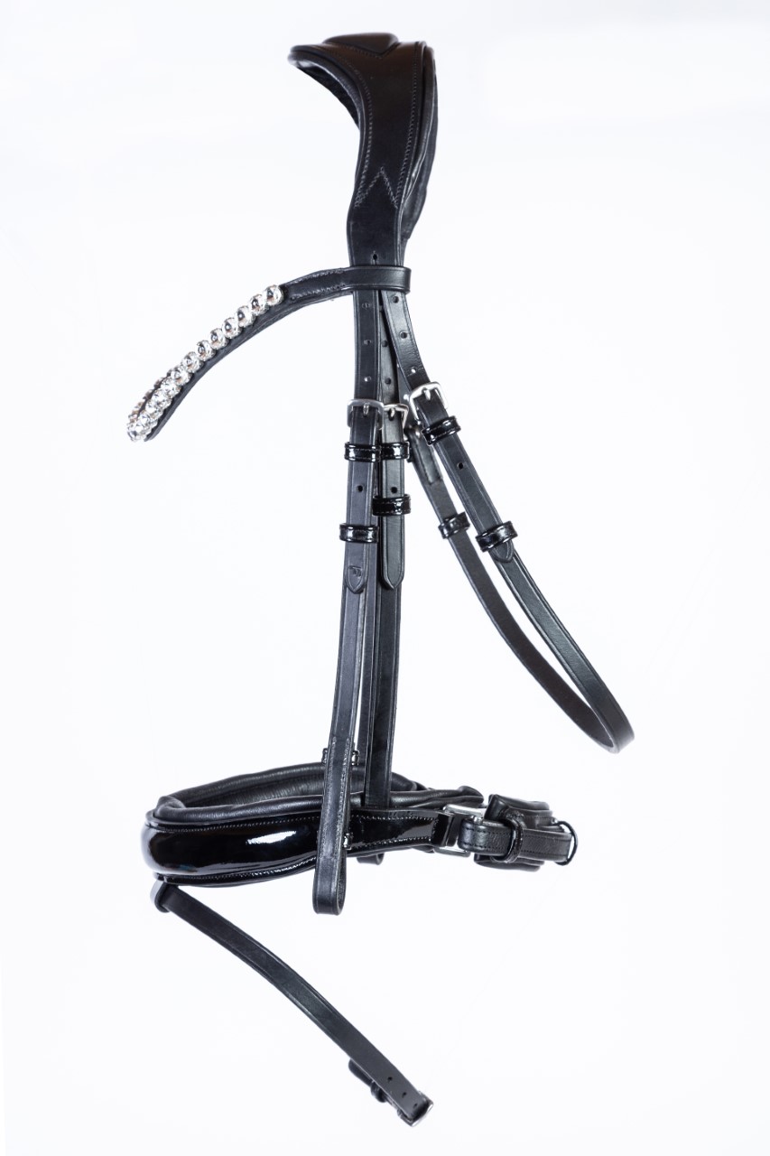 Introducing the Luxe of London Badminton Anatomical Flat Snaffle Bridle available exclusively in the UK from The Centre Line. Taking all the latest research available on performance tack, the Badminton Anatomical Flat Snaffle Bridle was designed for your horse’s ultimate comfort. Beautifully handmade from the finest European leather, combined with soft sheep leather which has been used on the inside of the headpiece and noseband. The outer of the noseband is in an elegant soft patent and this is mirrored with the crystal brownband.