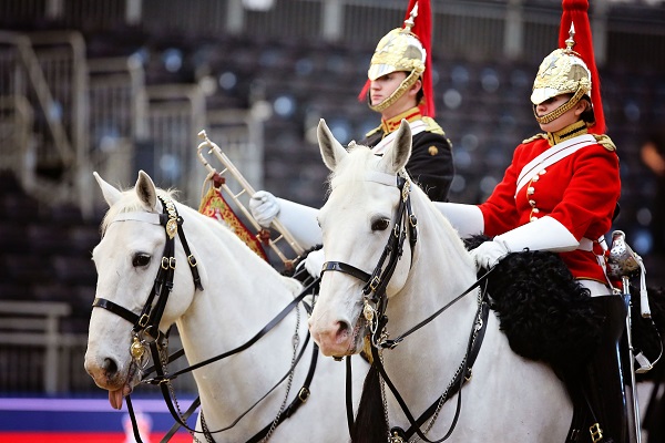 Musicians from The Household Cavalry Mounted Regiment during rehearsals at Olympia