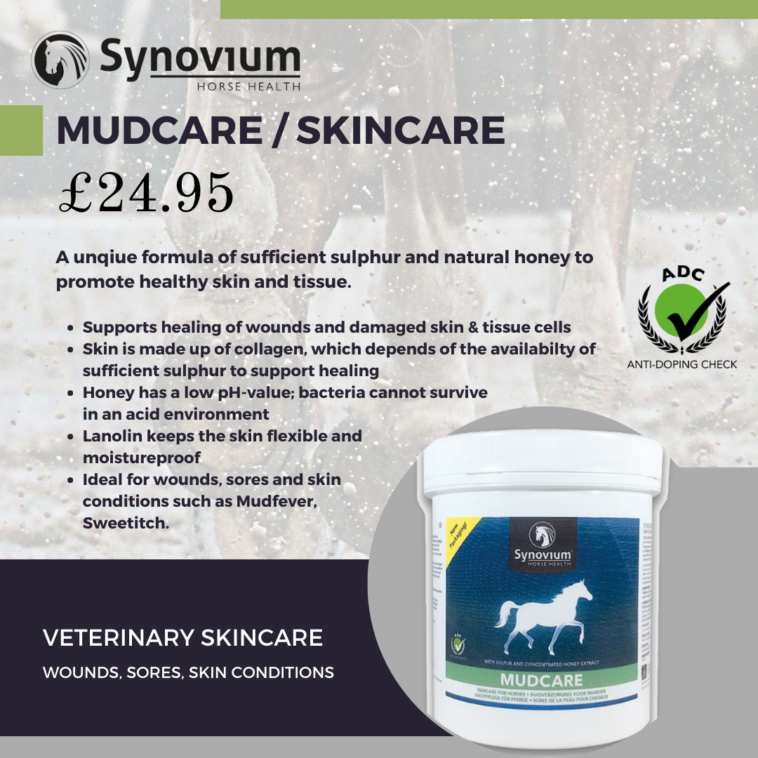 Use a specialised product such as Synovium’s veterinary Mudcare to help keep Mud Fever away. Mudcare contains Lanolin which works by keeping the skin flexible and moisture proof forming a protective layer between the skin and mud.