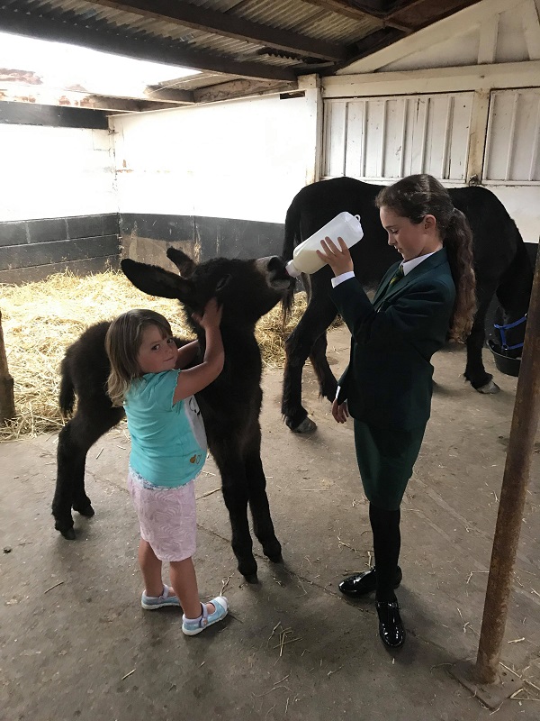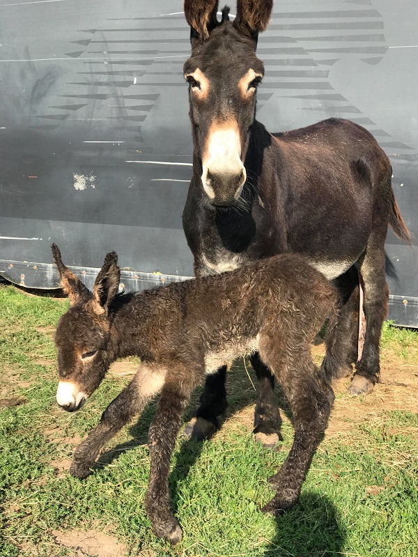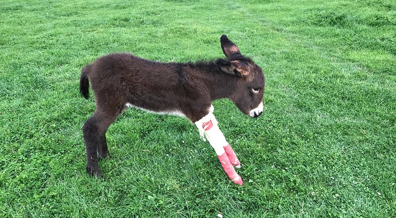 The little donkey was due to be born in August 2017 and the Nuttall family was very excited at the forthcoming arrival of a donkey foal from one of their favourite donkey mares and their coloured jack donkey, Tyson. Donkey mares are pregnant for a long time – around 11 to 14 months and so this foal had been eagerly awaited. The stable was ready for the birth and a camera was set up so they could keep an eye on things. But once the foal was born and checked over, John soon realised there was a problem. The foal’s front legs weren’t straight and bent round so he was unable to walk and stand properly. This meant that he couldn’t stand up to suckle from his mother and in a newly born foal, this is a serious problem.
