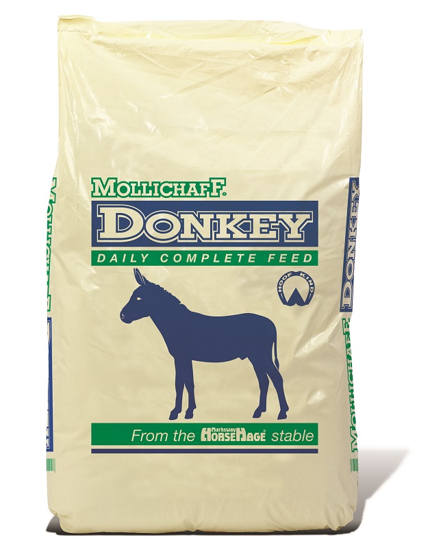 All John’s donkeys are fed on Mollichaff Donkey which is a fibre-based complete feed specially formulated for donkeys and is low in starch and sugar. When fed a at the recommended level, it needs no further supplementation other than good quality forage or it can be used as a total forage replacer. It contains a broad spectrum vitamin and mineral supplement which includes magnesium and limestone, and is made from a balanced blend of dried grass, fibre pellets, oat straw and soya oil with camomile, mint and lemon balm. Donkeys can eat adult food from around a month old but still require their mother’s milk which contains vital nutrients and Twister already enjoys tucking into his Mollichaff Donkey each day.