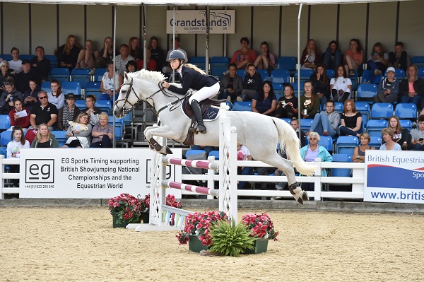 Eloise Squibb and Rudgeway Maestro were crowned the winners of the Blue Chip Pony Newcomers Masters in the final class of the day at the British Showjumping National Championships 2019. As the combination were early to go in the jump off, they knew they had to be quick. Eloise flew round the up to height course and finished 0.3 seconds ahead of second place Glain Watkin Jones.